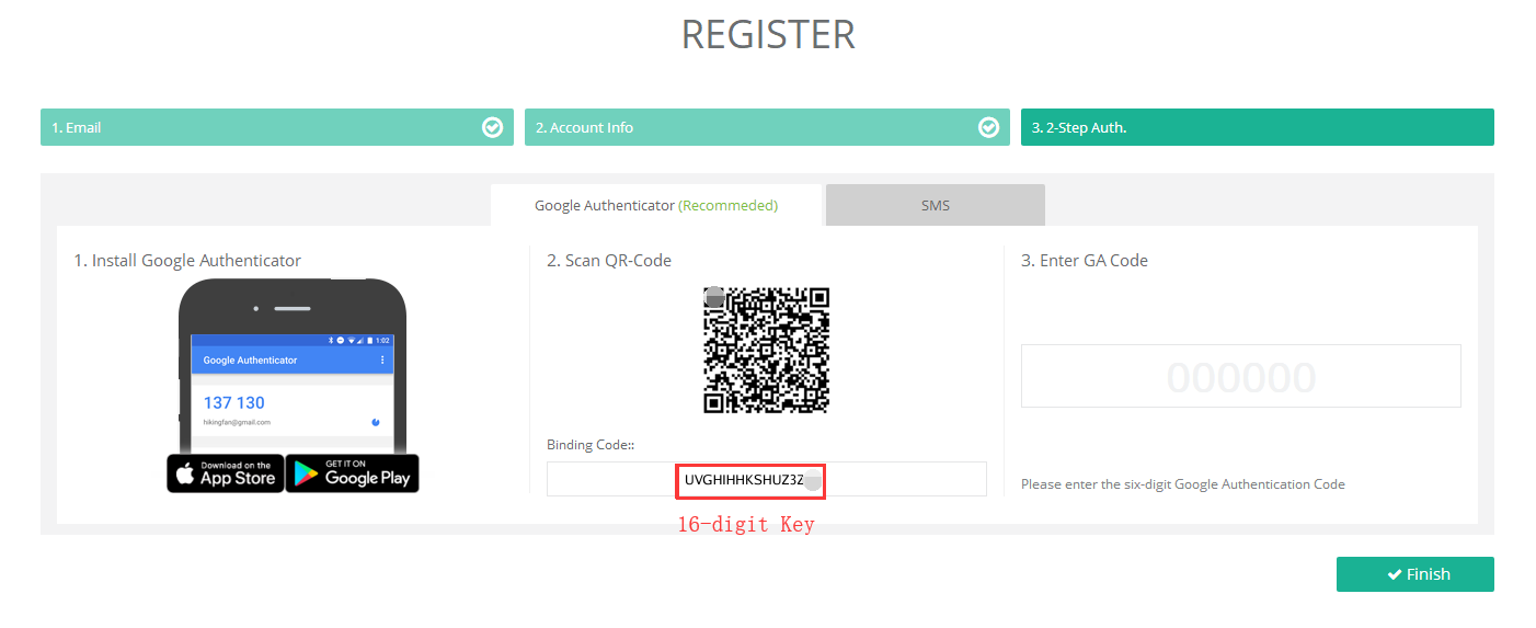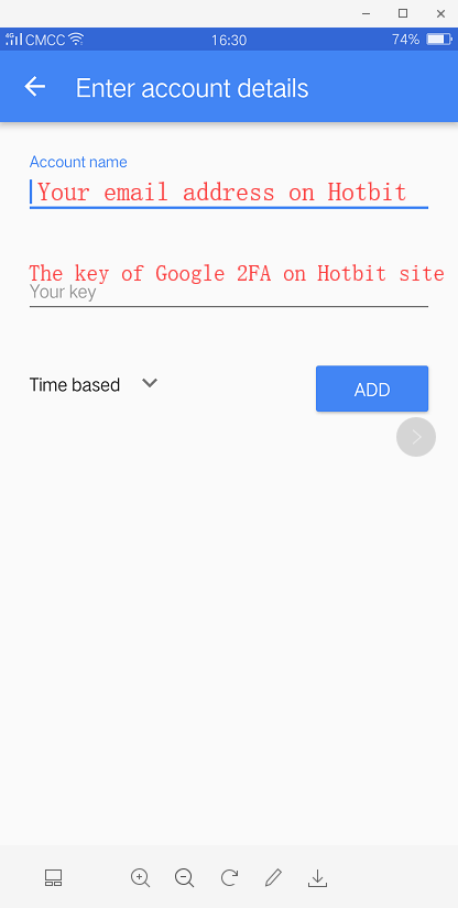 2. Пожалуйста , войдите на сайт Hotbit www.hotbit.io , откройте Google Authenticator со своего телефона, чтобы отсканировать QR-код, или введите свой адрес электронной почты и ключ (сохраните секретный ключ, 16-значный ключ), который появляется на сайте Hotbit.